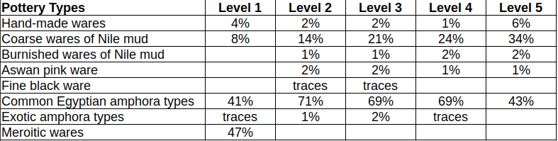 Among almost 35,000 potsherds recovered from these five deposits, the archaeologists identified 28 types of previously recorded Egyptian and Nubian wares. Only few exceptions were classified as unfamiliar types. As noted in Figure 1, the total pottery was divided into eight major groups.