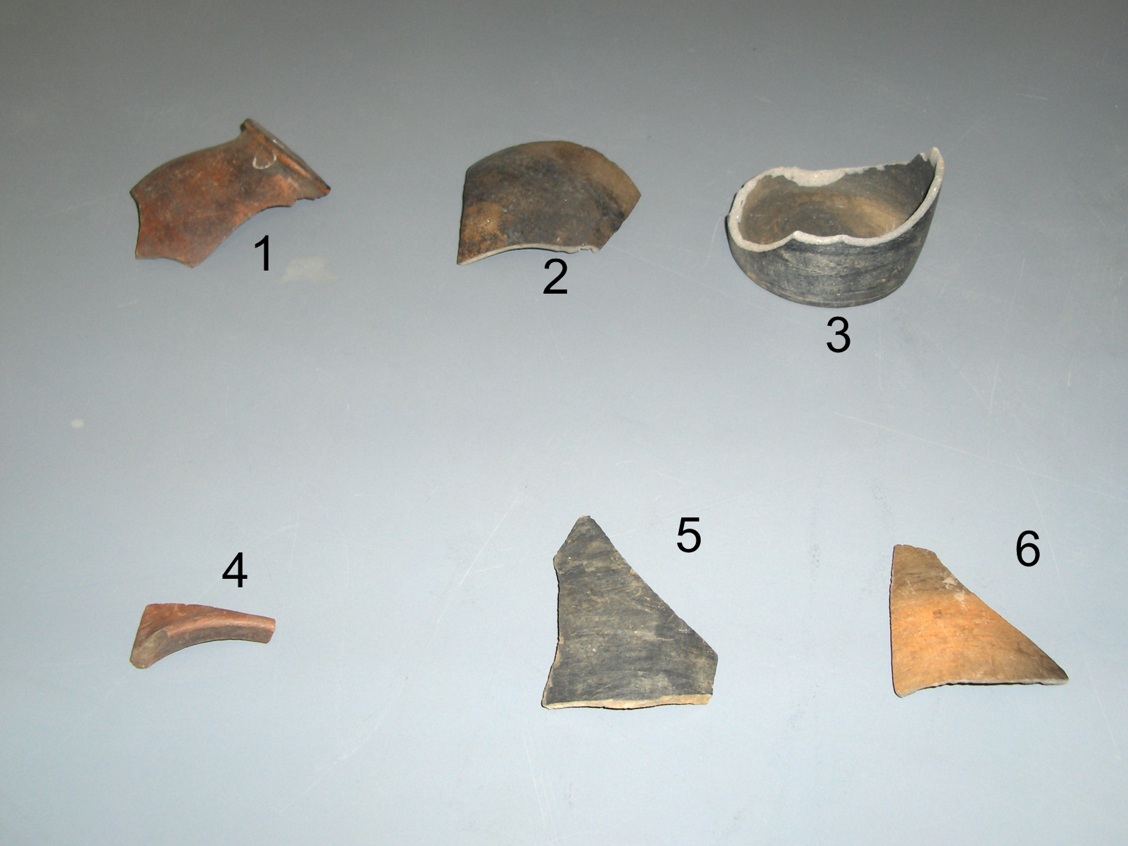 As noted in Figure 3, the fine black ware samples are the following: BR 1 is a ring base from an open form, 5cm in diameter. The length of the sherd is 5.3cm and its wall thickness is 2.6mm. BR 2 is a 5.1cm long piece from the walls of an unknown vessel form, 2.1mm wall thickness. BR 3 is a flat base from a small goblet, 6cm in diameter and 2.5mm in wall thickness. BR 4 is a tiny piece of inflected rim, possibly from a bowl, 2.8cm long and 2mm thick. BR 5 is a 5cm long wall fragment from an unknown vessel form, 2.9mm in wall thickness. BR 6 is a 4.3cm long fragment from the walls of an unknown vessel form, 2.4mm in wall thickness.