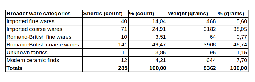Chart 1 presents the distribution of the ceramic assemblage by count and weight, divided in six simplified ware categories. According to the chart, almost half of the total ceramic assemblage by count consists of Romano-British coarse wares, followed by almost a quarter of imported coarse wares. This means that 74,4% of the total ceramic assemblage consists of coarse utilitarian pottery and only 21.4% associates with local and imported fine ware fabrics. Even though the majority of coarse wares are locally made, the majority of fine wares (14.4% by count) are imported from the European mainland.