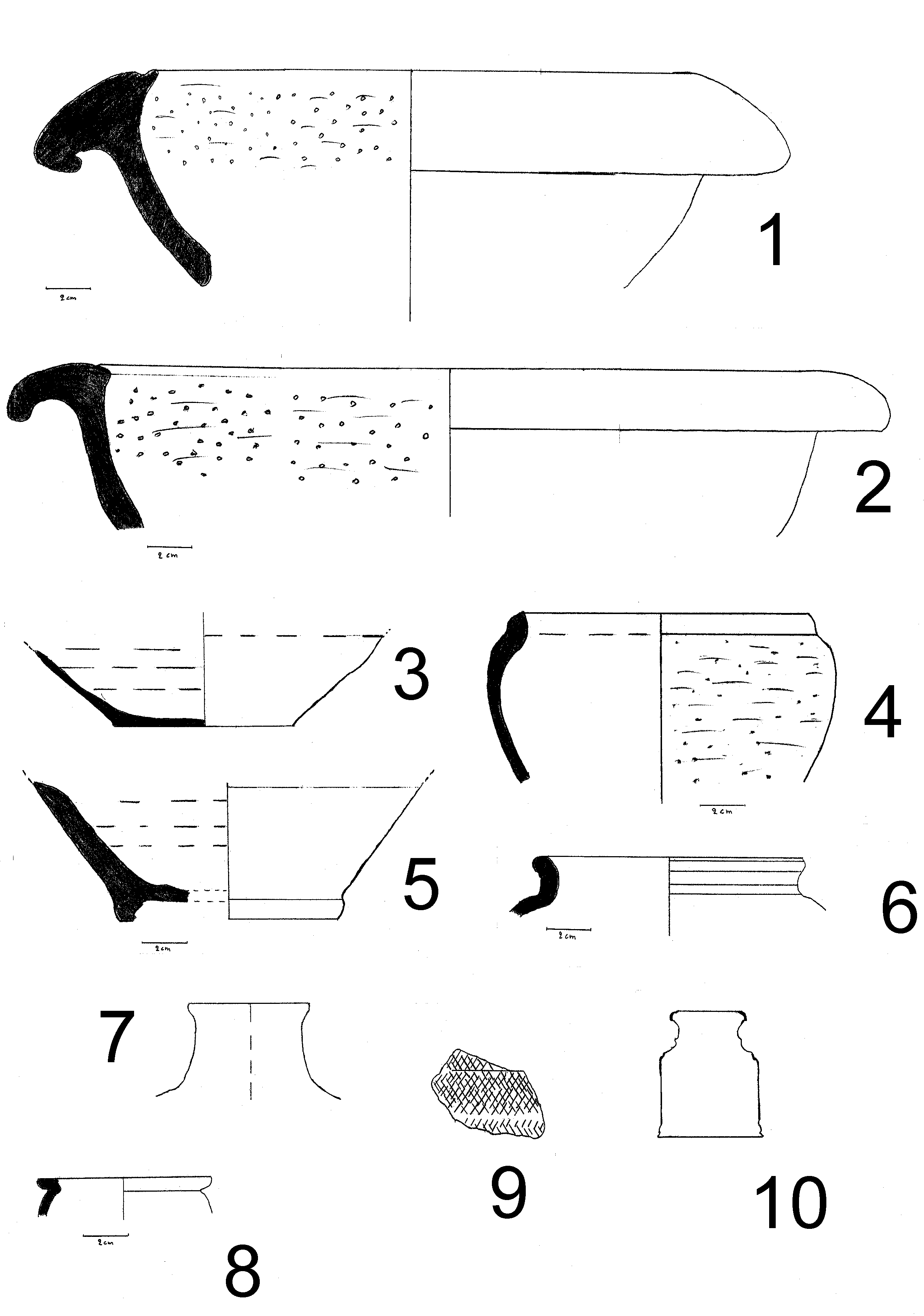 Ditch fill 116 in trench 1 (evaluation AS41/2001) produced four sherds, one of which is a base fragment from a bowl, 7cm in diameter (Figure 1, n.3). Ditch fill 118 in trench 1 produced four fragments from a flat-based bowl, 8 cm in base diameter. The bottom of this base fragments carries an incised letter ‘K’, possibly part of the producer’s signature or the workshop’s initials. Such potter signatures are likely to suggest that these vessels were fired in a communal kilns.