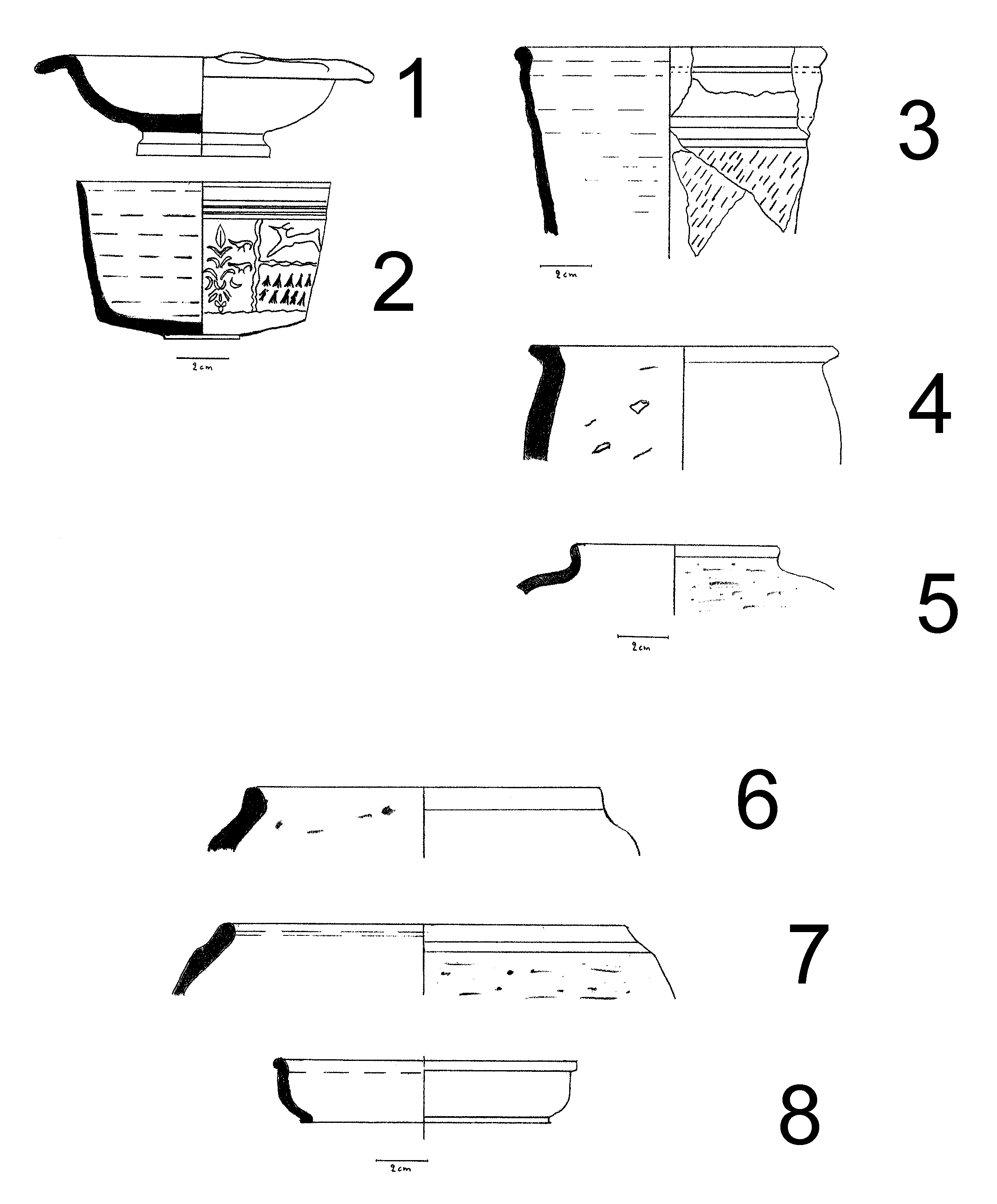 The typical local coarse ware fabric is generally grey (2.5YR 6/0, 7.5YR 6/0) or dark red-brown (7.5YR 4/2, 5YR 3/4), with a wide grey carbon streak covering most of the fracture. It has medium to coarse texture and its hardness varies from medium to soft. The fabric’s main inclusions are medium to large-sized sub-angular to angular quartz grains, small quantities of black and red iron ore particles, mica up to 5% and sometimes grey, white or red clay pellets. Two sherds contain pieces of crushed grey flint. This fabric has no specific reference in the National Roman Fabric Reference Collection; therefore, it is abbreviated as LGCW for the needs of this report. Examples of such fragments are presented in Plate 1 (n.13, 15-16) and Plate 3 (n.21-24). Ditch fill 107 (evaluation AS41/2001) produced a wheel-made rim and neck fragment from a flagon, 9cm in rim diameter (Figure 1, n.7). Ditch fill 505 (evaluation AS41/2001) produced a rim fragment from a late Roman ovoid jar with everted flat rim (Figure 1, n.8).
