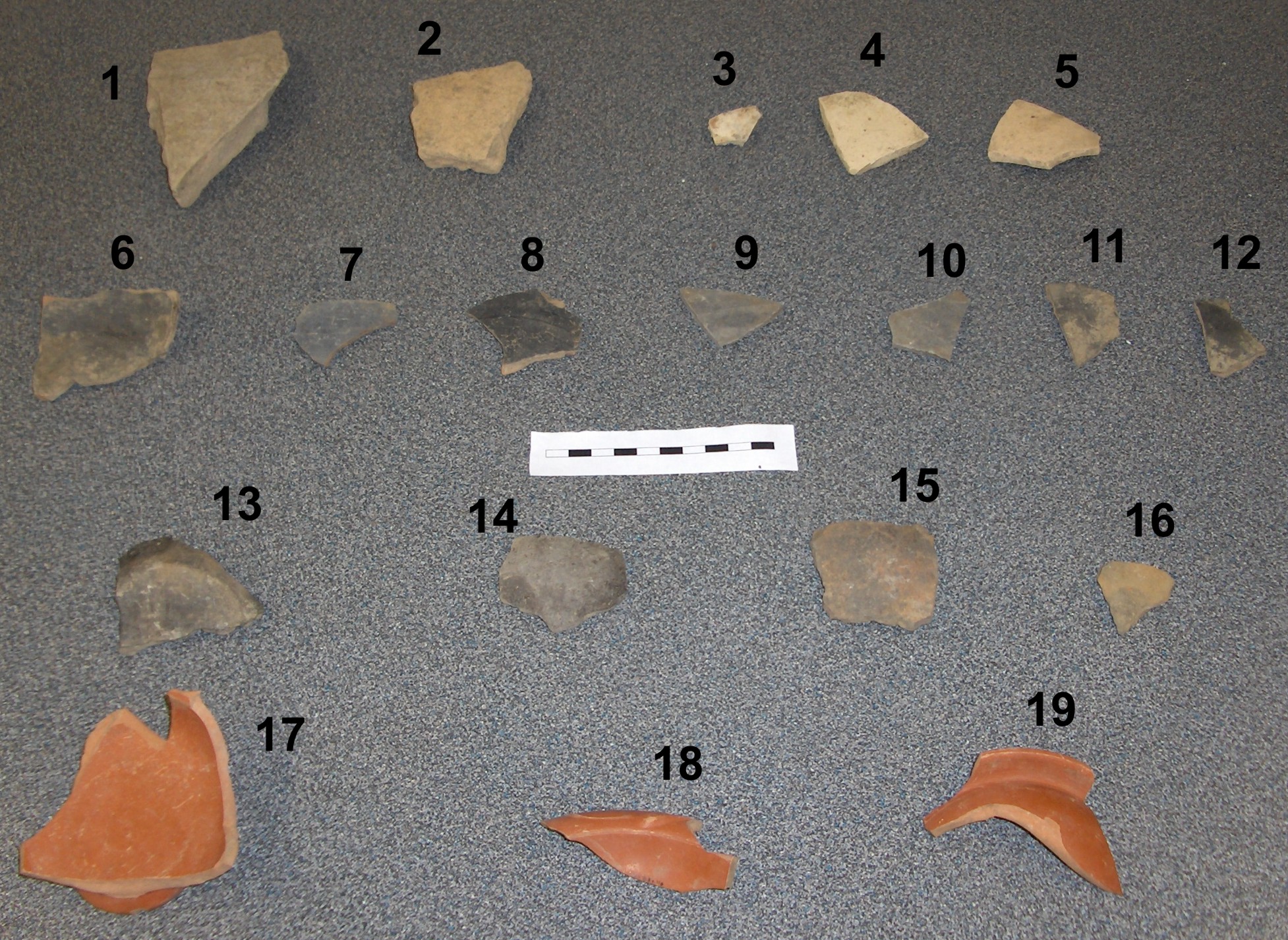 The site produced four sherds of North Gaulish imports weighing 42 grams. Such sherds come from small-sized table wares, possibly bowls or jars, which are poorly preserved. Their fabric is cream (10YR 8/3), medium-soft and their feel is difficult to determine due to surface deterioration. Their main inclusions are well-sorted sub-angular quartz grains, sparse limestone and very small red and black particles, probably iron-rich, up to 3%. Their fabric matches NOG WH 4 of the National Roman Fabric Reference Collection (Tomber & Dore, 1998, 75).