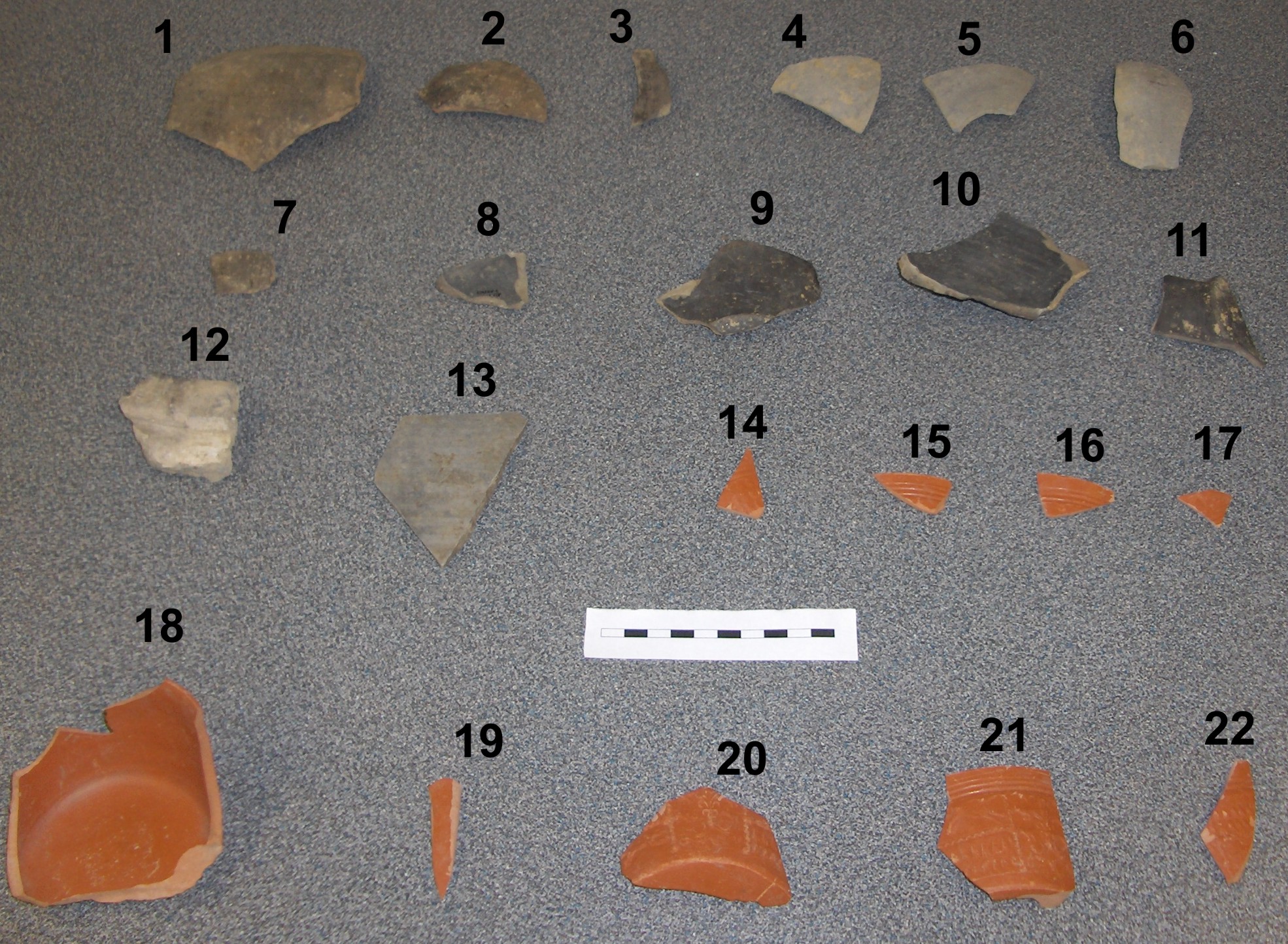 Ditch fill 107 in trench 1 (evaluations SA41/2001) produced four sherds, which come from a single bowl, 8cm in rim diameter (Figure 2, n.8). The bowl belongs to Fulford’s Type 57.4 (Fulford 1975, 63) with its characteristic everted and pointy rim, dating in the Late Roman period. Another two sherds were recovered from ditch fills 15 and 23 during the excavation of the site (AS4143/2002) (e.g. Plate 4, n.23).